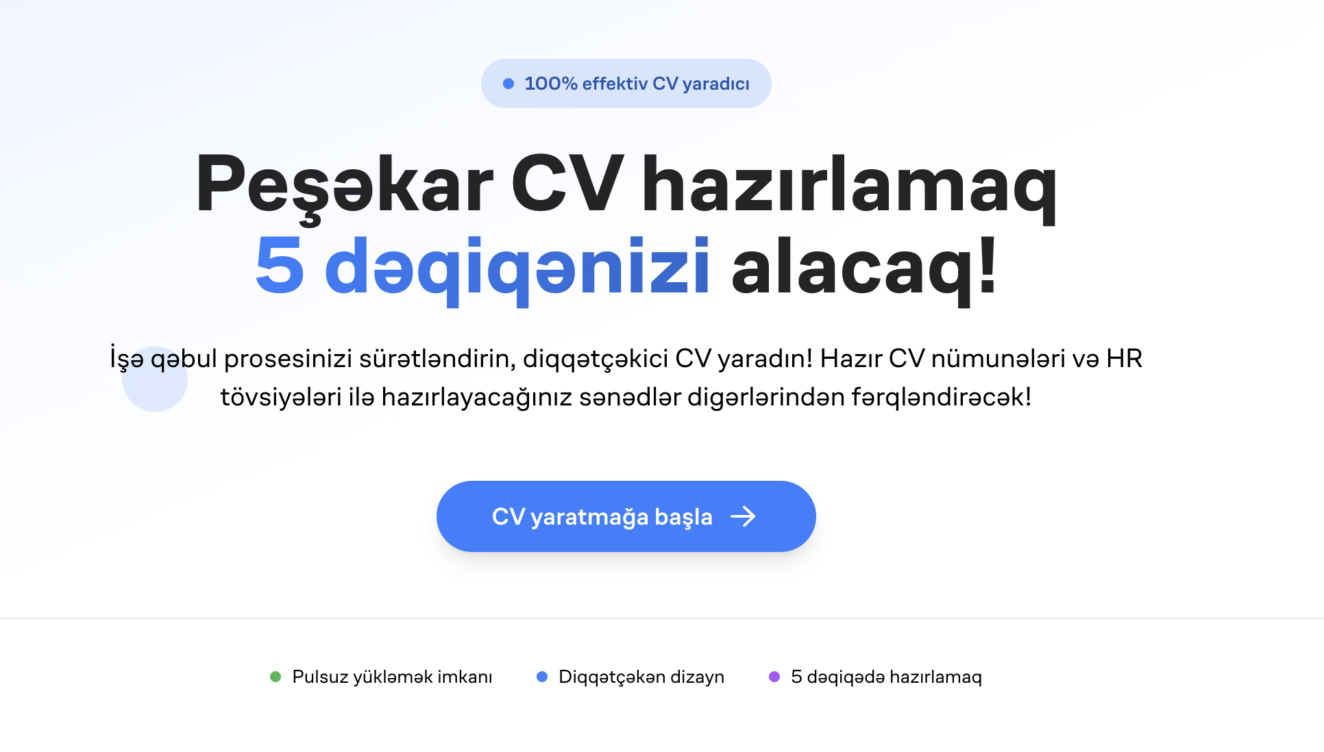 Azerbaycan’ın en dinamik kariyer platformlarından biri olan Work.az, CV hazırlama zahmetini ortadan kaldırıyor ve size sadece birkaç dakika içinde dünya standartlarında bir özgeçmiş sunuyor.