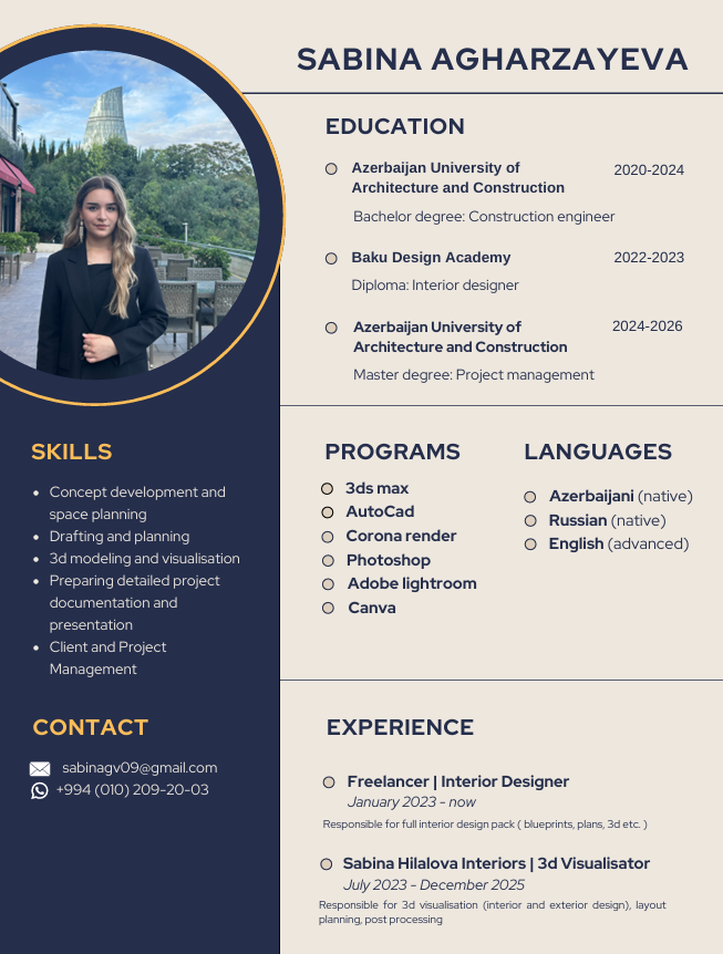 Detallara diqqət və aydın kommunikasiya ilə funksional, estetik və həyata keçirilə bilən məkanlar yaradıram.
